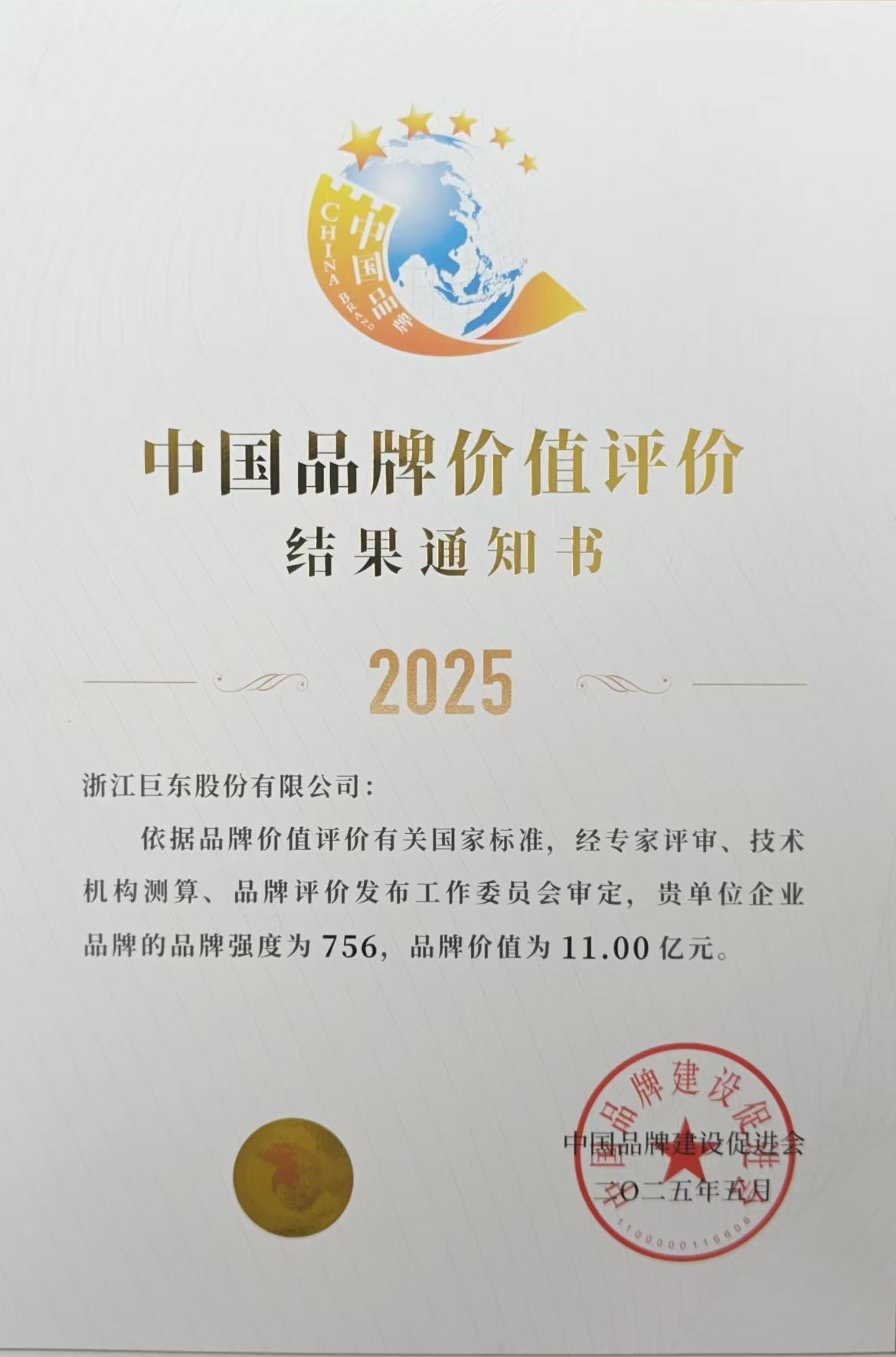 2025中國品牌價(jià)值評價(jià)結(jié)果通知書-品牌價(jià)值11億元